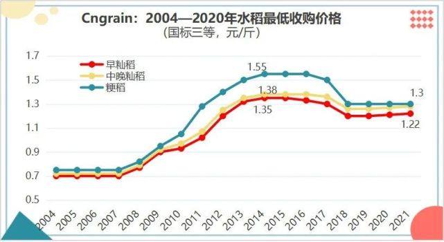 2月26日,国家发改委公布了2021年稻谷最低收购价,2021年生产的早籼稻(三等,下同)、中晚籼稻和粳稻最低收购价分别为1.22元/斤、1.28元/斤和1.30元/斤,籼稻比上年提高一分钱,粳稻维稳不变。