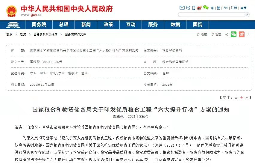 ——《粮食品种品质品牌提升行动方案》:持续开展“中国好粮油”行动,聚焦增加绿色优质粮油产品供给,着力优化粮食供给结构,促进粮油品质提升,打造优质粮食品牌,搞活粮食市场和流通,加快粮食产业创新发展、转型升级、提质增效。到2025年,优质粮食供给更加丰富,粮食品质明显提升,粮食品牌体系更加完善,粮油品牌和营销市场竞争力持续提升。充分融合“好粮油”销售示范点、粮食应急供应网点、军粮供应网点和主食厨房等,健全线上线下营销体系,加快由“吃得饱”向“吃得好”“吃得营养健康”转变。