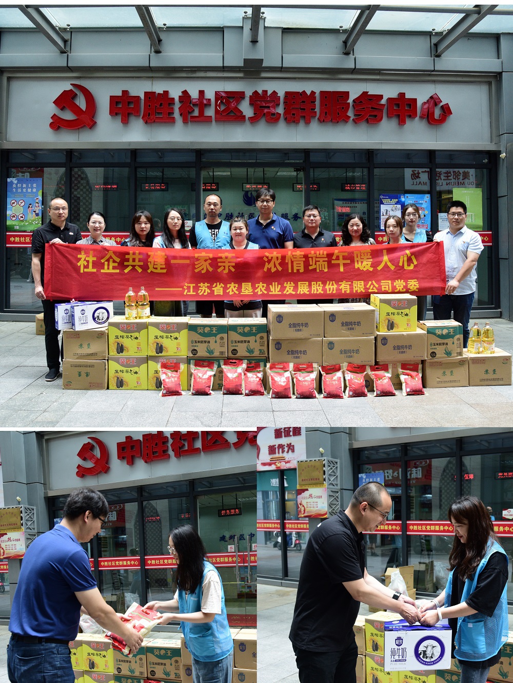 在端午节来临前夕,为弘扬中华传统美德,加大与所辖社区共驻共建力度,营造文明和谐的节日氛围,6月21日,苏垦农发到建邺区沙洲街道中胜社区开展“社企共建一家亲 浓情端午暖人心”慰问活动,给社区一线网格员们送去慰问品和节日祝福。