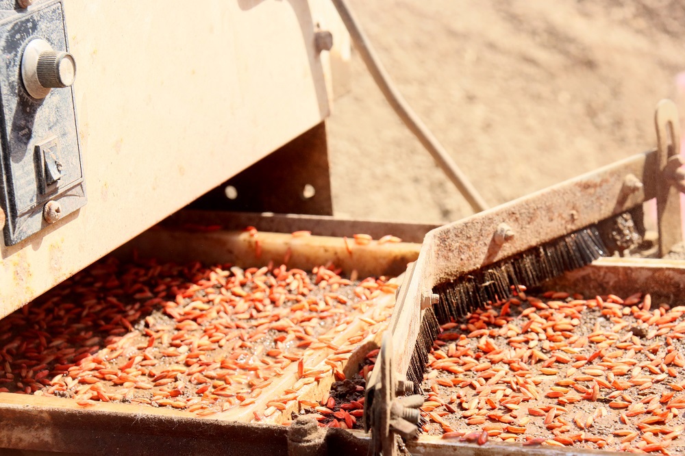 东洋生产区今年计划种植水稻7560亩,推广微喷灌育秧3000亩。在68大队秧田,全体管理人员正在对微喷灌材料进行组装,有条不紊开展微喷灌育秧试验。不一会功夫,一根根微喷带就整齐的排列在秧板上,随后对微喷带对接、喷幅、水压等进行试验调整,确保喷洒高度适中、喷洒均匀。在70大队,清晨天刚蒙蒙亮,大队负责人徐玉宝就开始忙碌了起来。种子、垫 木、床土等育秧物资准备就绪,10多名工人在育秧生产线上进行流水作业,从挑选放置秧盘、填土、洒水、配种、配土到出盘,仅数秒钟1个育秧盘就下了“流水线”。播种后的秧盘进行集中暗化处理,置于适宜稻种发芽的暗环境下,进行“叠盘”,再用毛毯和塑料布盖严实,来克服外部因素带来的不利影响。随着育秧流水线的运转,机器发出“吱吱呀呀”的声响,场面上呈现出一片热火朝天的繁忙景象,大家火力全开、奋力冲刺,为实现全年工作目标任务努力奋斗。
