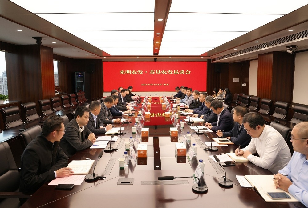 11月18日下午,光明农业发展 (集团) 有限公司与江苏省农垦农业发展股份有限公司在南京举办恳谈会。省农垦集团总经济师、苏垦农发党委书记、董事长朱亚东主持会议,光明农发集团党委书记、董事长陈斐然,省农垦集团党委委员、苏垦农发总裁丁涛,光明农发集团总裁吴伟峰参加座谈交流。