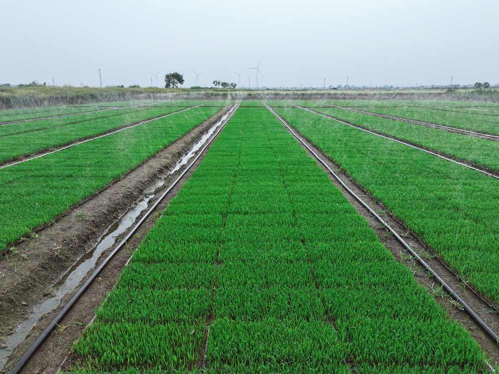 端午时节,苏垦农发东辛分公司托管基地的水稻秧田生机勃勃。今年,托管基地1.2万亩水稻全部推广微喷灌育秧技术,实现技术全覆盖,标志着传统水稻育秧向节水高效模式的跨越。